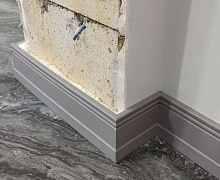 Способ монтажа: плинтус из полистирола высокой плотностизапиливается под 45 градусов при помощи ножовки и стусла. Для аккуратного оформления стыков используется специальный клей-шпатлёвка Adefix F, с помощью которого можно замазать царапины и вмятины.